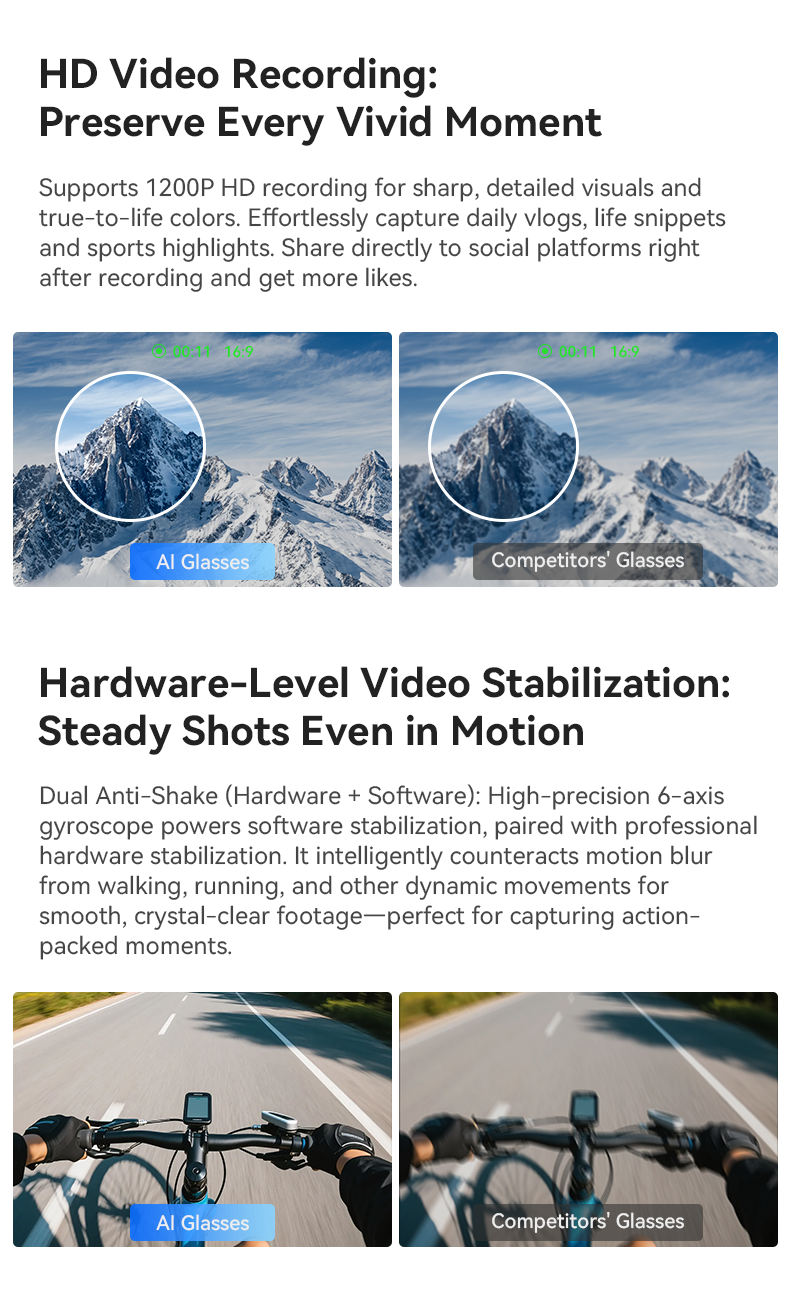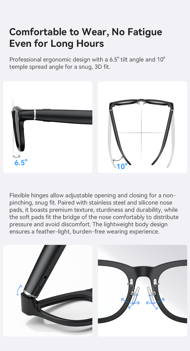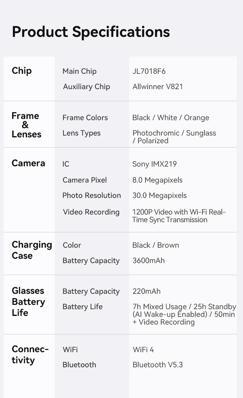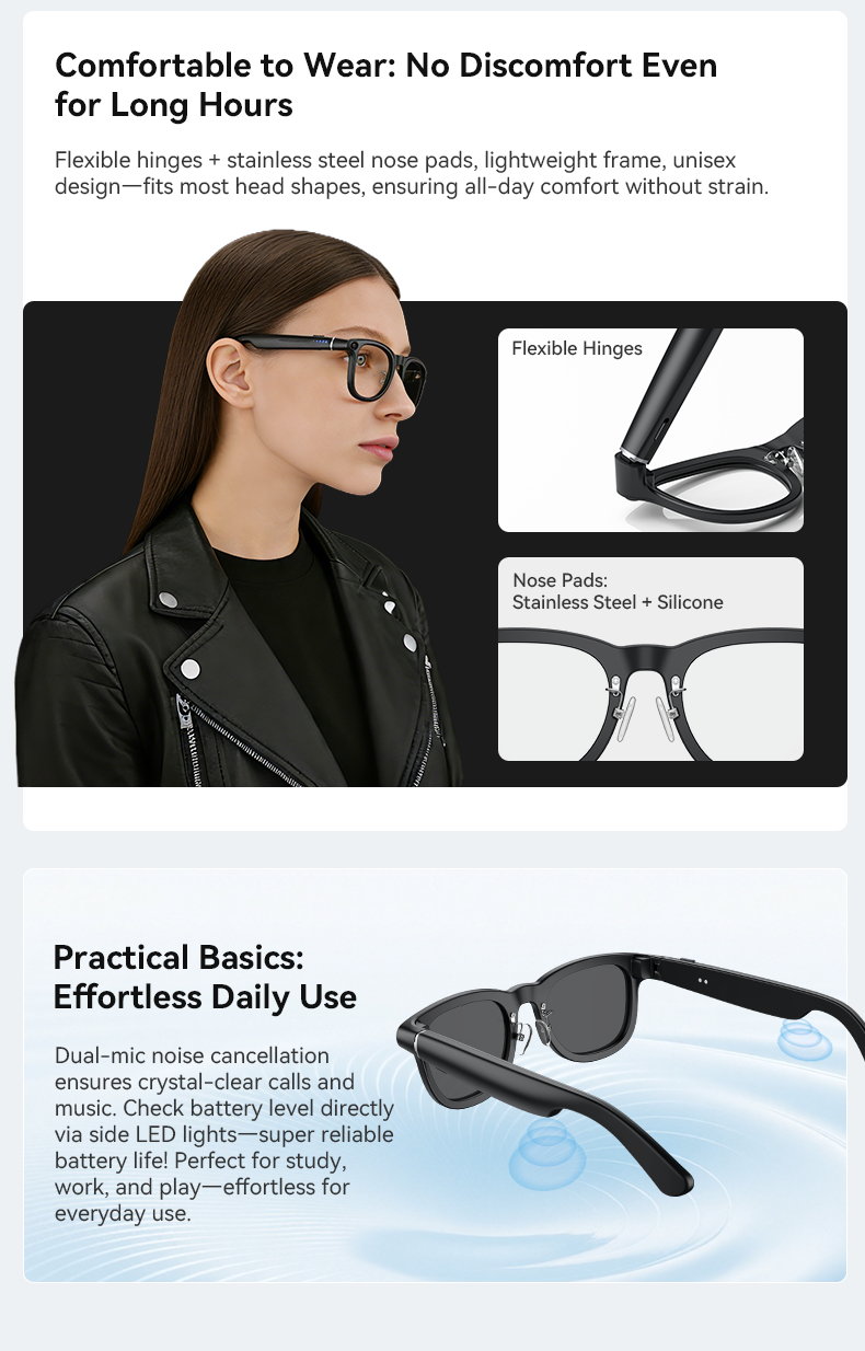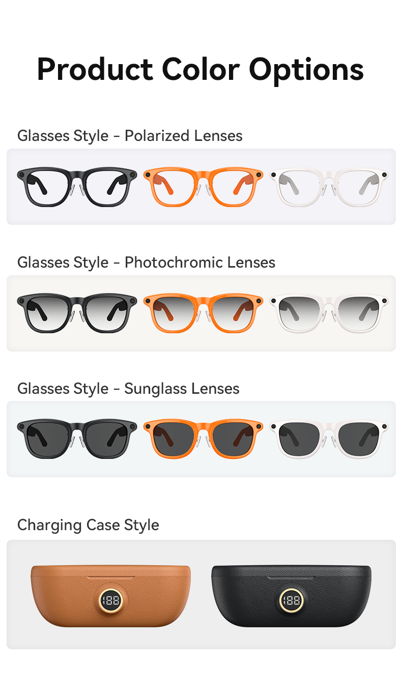 Long-Lasting Battery & Charging Case: 220mAh glasses battery + 3600mAh charging case (reverse charging for phones), providing 6–7 hours of music playback and 50 minutes of video recording.