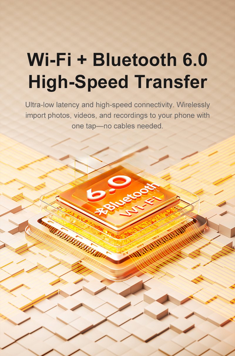 Bluetooth 6.0 Low Energy and Wi-Fi transmission for instant photo/video/audio backup to your phone