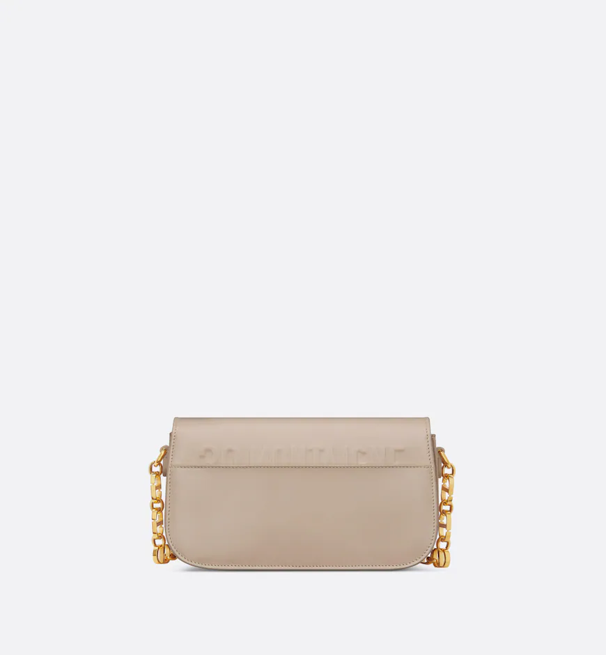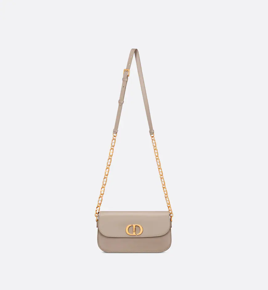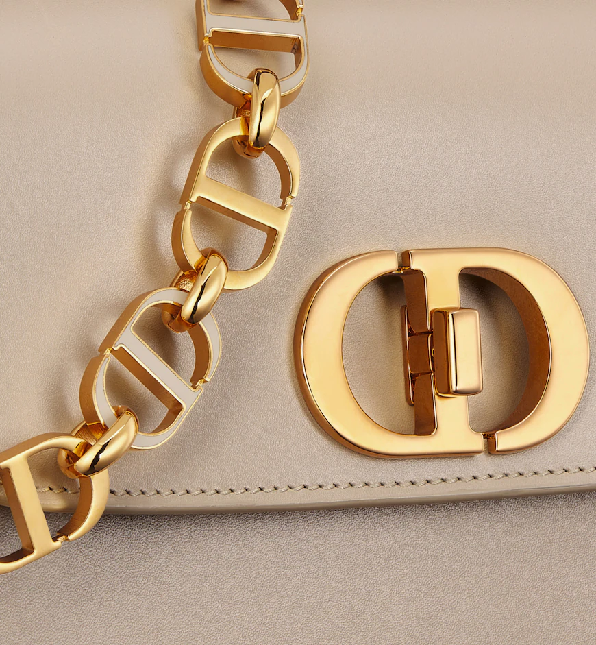 calfskin, the rounded flap with delicate curves is punctuated by an antique gold-finish metal CD twist clasp inspired by the seal of a Christian Dior perfume bottle. The design is completed by other details, like the 30 Montaigne signature embossed on the back and the signature chain alternating gold-finish metal and tonal enamel links that match the leather. The small, gusseted bag features a refined silhouette that can be carried by hand, worn over the shoulder or crossbody.