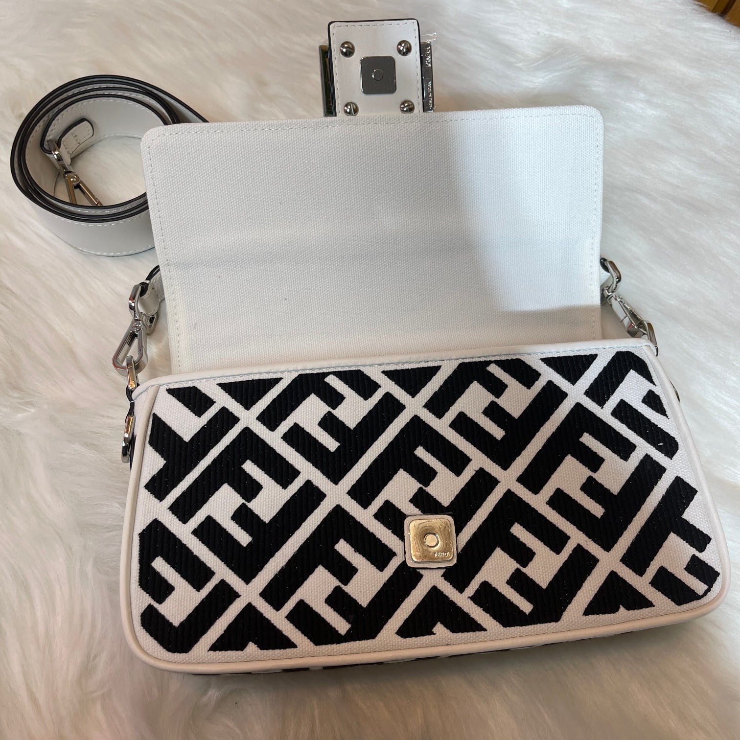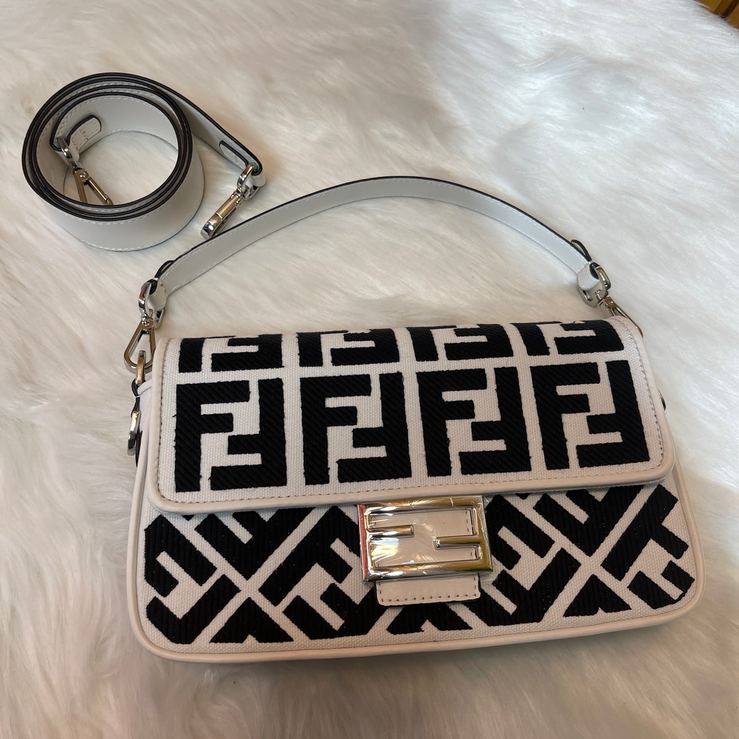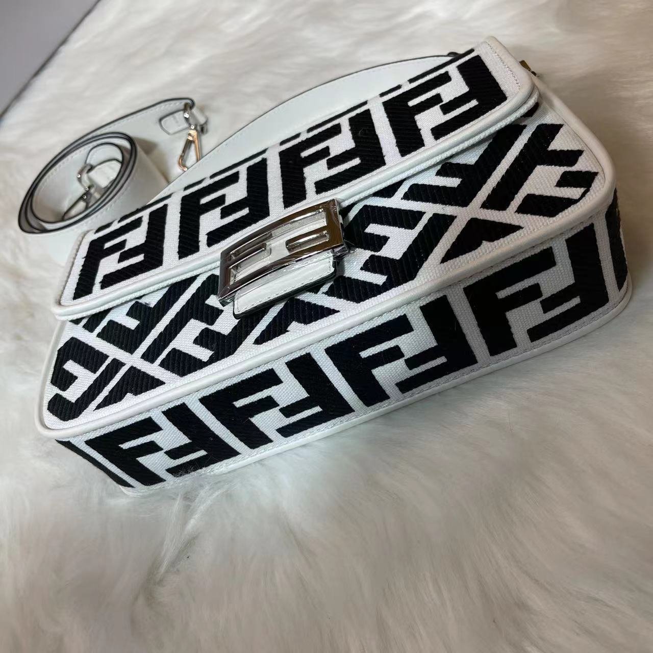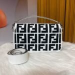 2023 Fendi’s latest baguette bag: very summery; 🌈 black F embroidery color. This black/white Fendi Baguette is sure to be a trendy item this summer! It looks great on the top; Attendance is also particularly high; It’s absolutely fine for a concave shape. Very lightweight. And its capacity is also very powerful; Easily meet your daily needs. With a short strap and a wide shoulder strap; Can be carried on one shoulder and crossbody. Very versatile. It’s easy to wear no matter what style you have. Carry it and you’ll be the brightest goddess in the crowd. Model F2029 Size 26-5-15CM