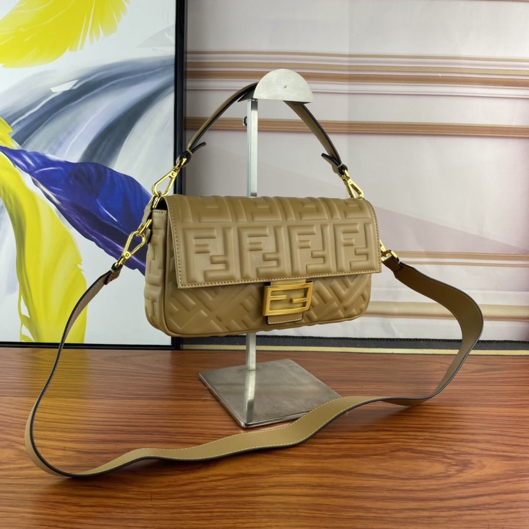 Clamshell magnetic snaps. Equipped with FF magnetic buckle. Lined with zipper bag. With removable shoulder strap, handbag can be shoulder or crossbody. (Sheepskin). Decorated with FF embossed pattern. Gold metal part number F0191