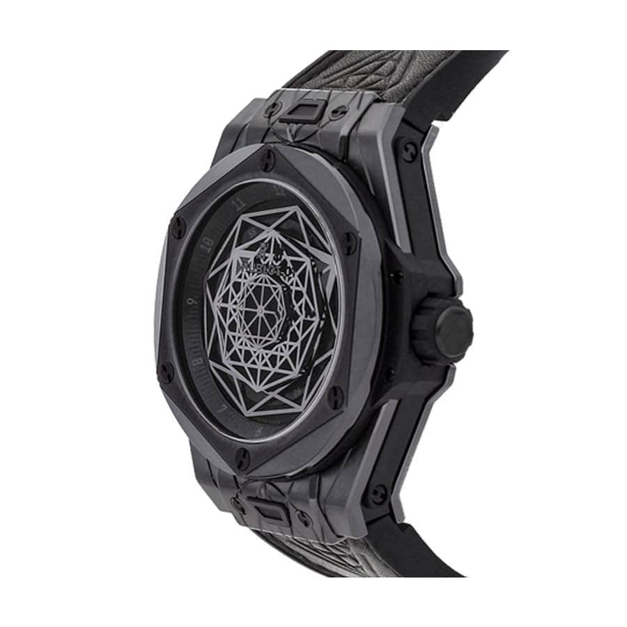The Hublot Big Bang Sang Bleu All Black 415.CX.1114.VR.MXM17 Replica is a luxury watch. It features a 904L stainless steel case and bezel. both in titanium black. and a sapphire crystal. The movement is an automatic caliber 9015 with a power reserve of 60 hours and a precision of -3/+3 seconds per day within COSC certification limits. The second hand has a sweep motion. The bracelet is made of leather and has adjustable links for all sizes. with a 904L stainless steel folding clasp in steel.