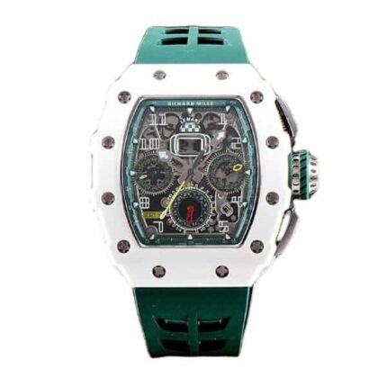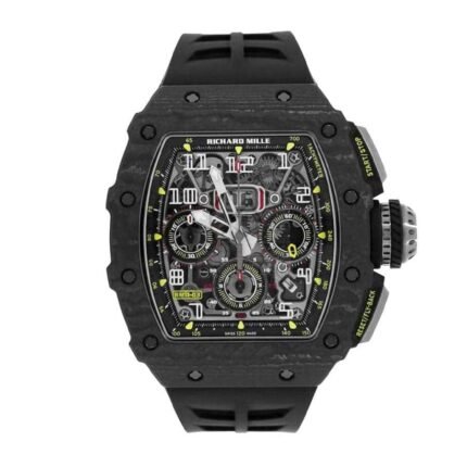 The Richard Mille RM011 Romain Lotus F1 Rose Gold NTPT Carbon Replica is a luxurious watch with a unique design. The watch features an automatic movement with a 7750 caliber and a power reserve of 60 hours. It is certified within COSC limits for precision and has a sweep motion second hand. The case is made of carbon and is black in color. with a carbon bezel of the same color. The crystal is sapphire and the size is 50.00 mm. The bracelet is made of rubber and is adjustable for all sizes. with a 904L stainless steel double-fold clasp.