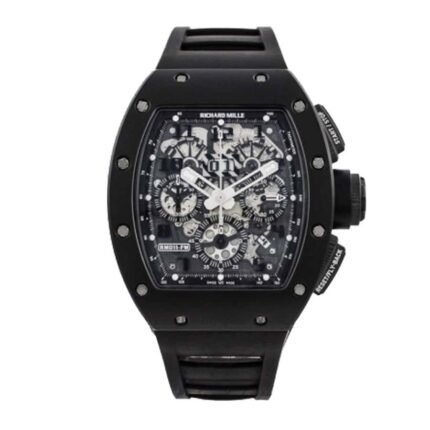 The Richard Mille RM011 Romain Lotus F1 Rose Gold NTPT Carbon Replica is a luxurious watch with a unique design. The watch features an automatic movement with a 7750 caliber and a power reserve of 60 hours. It is certified within COSC limits for precision and has a sweep motion second hand. The case is made of carbon and is black in color. with a carbon bezel of the same color. The crystal is sapphire and the size is 50.00 mm. The bracelet is made of rubber and is adjustable for all sizes. with a 904L stainless steel double-fold clasp.